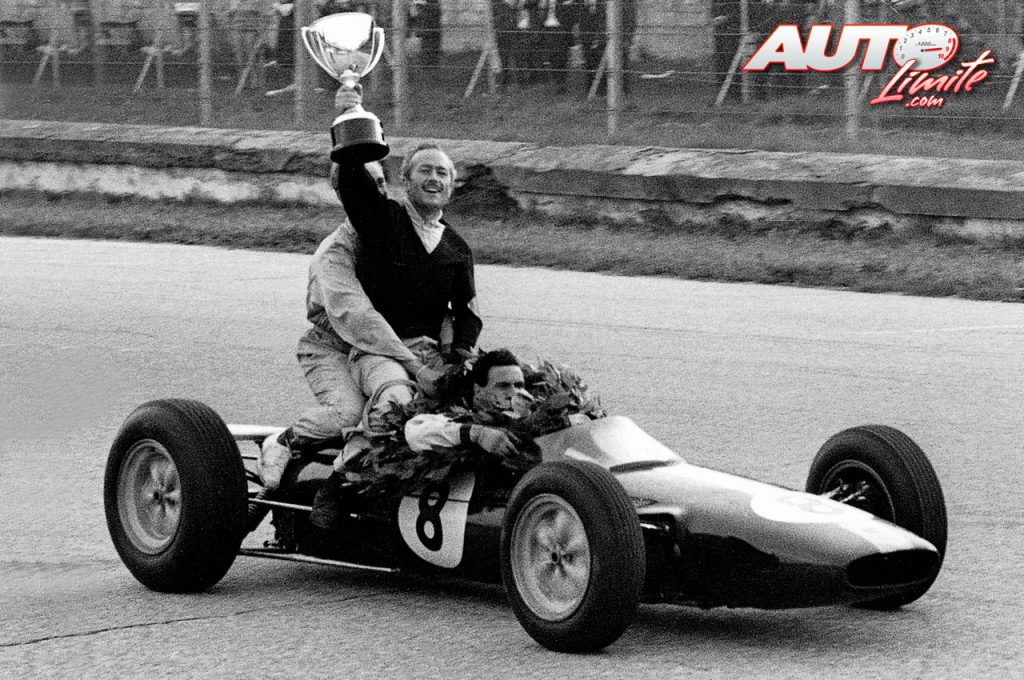 Al finalizar el Gran Premio de Italia de 1963, el patrón del equipo Lotus, Colin Chapman, paseo a “lomos” del Lotus 25 el trofeo de vencedor obtenido por Jim Clark en el circuito de Monza. Por si fuera poco, sobre el monoplaza se subió también Mike Spence, el segundo piloto del equipo Lotus, que había tenido que abandonar por una avería a lo largo de la carrera.