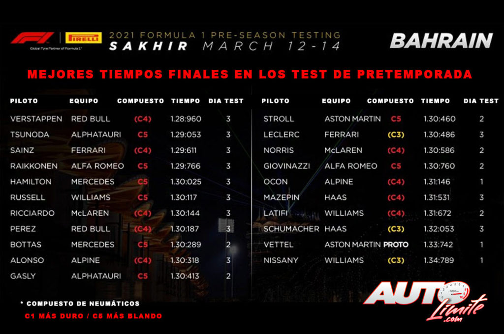 Mejores tiempos por vuelta obtenidos durante los test de pretemporada realizados en el Circuito Sakhir de Bahréin.