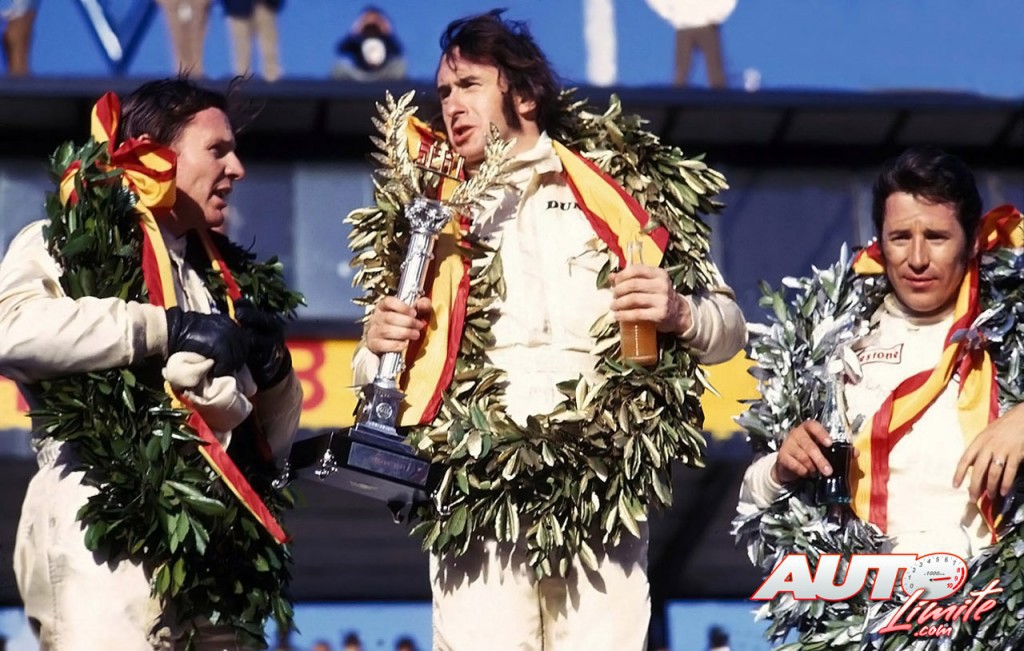 Durante el podio del Gran Premio de España de 1970, disputado en el Circuito del Jarama, una de dos, o no llegó el champán o los pilotos prefirieron brindar con unos refrescos. La carrera la ganó Jackie Stewart (en el centro), seguido por Bruce McLaren (a la izquierda) y Mario Andretti (a la derecha).