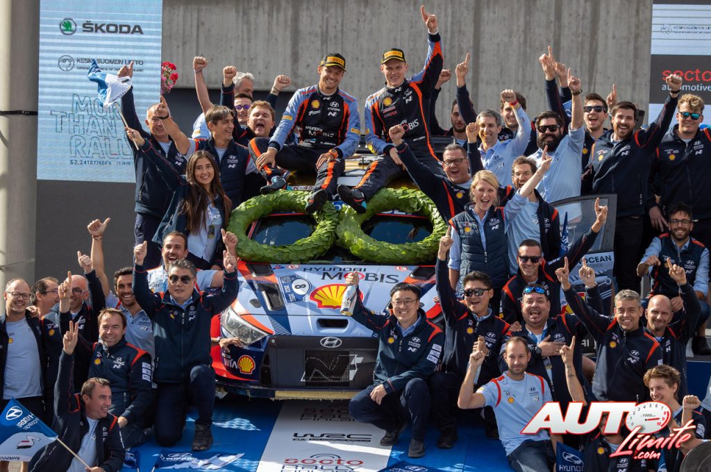 Celebración del equipo Hyundai Motorsport WRT por la victoria de Ott Tänak (Hyundai) en el Rally de Finlandia 2022, puntuable para el Campeonato del Mundo de Rallies WRC.