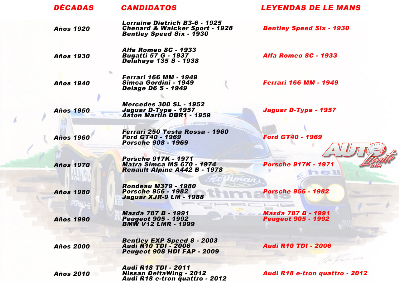Así pues, estableció una lista de candidatos para cada una de las décadas (en donde sorprendían algunas ausencias), a partir de la cual los más de 20.000 internautas votantes han establecido una primera selección de las “Leyendas de Le Mans” entre un total de treinta coches (tres por década).