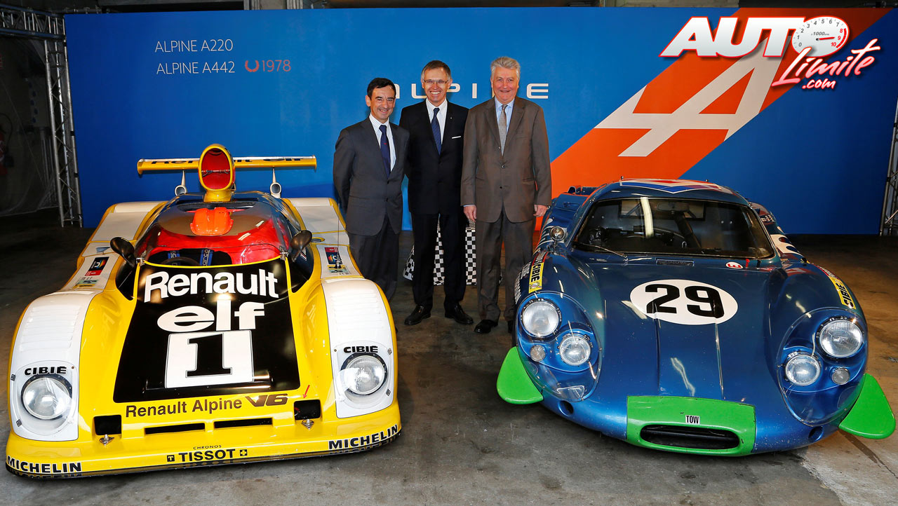 De izquierda a derecha: Pierre Fillon (Presidente del ACO), Carlos Tavares (Renault) y Bernard Ollivier (Alpine-Caterham) junto al Alpine-Renault A442 y el Alpine-Renault A220.
