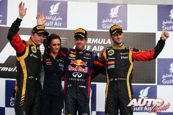 Viendo el podio del GP de Bahréin 2013, alguien podría pensar que acaba de despertarse de una larga siesta de un año de duración en una sala de sesión continua. Los mismos pilotos por el mismo orden: 1º Sebastian Vettel; 2º Kimi Räikkönen; 3º Romain Grosjean. Los mismos coches: Red Bull y Lotus, con los mismos motores Renault. Y las mismas burbujas, bajas en chispas, en la celebración del podio.