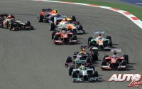En la salida, Vettel (Red Bull) contra Rosberg (Mercedes) y Alonso (Ferrari) contra Vettel. En esa pelea, el viento de cara en la recta principal convierte la corta 7ª marcha de la caja de cambios del Red Bull en escudo protector ante los mayores desarrollos de sus enemigos. Massa (Ferrari) se toca con Sutil (Force India) y Di Resta (Force India) lucha por un lugar en el podio.