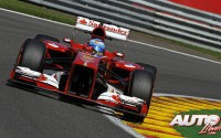 Fernando Alonso (Ferrari), poderosa garra sobre el nuevo asfalto estriado de la parrilla de salida de Spa, ejecutaba un arriesgado slalom desde su novena casilla antes de saltar al vagón de cabeza, para no quedarse en la soledad del andén con el billete comprado para la “Estación Termini”.