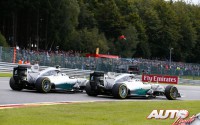 Tras desprenderse del piloto de Red Bull, Nico Rosberg (Mercedes) se lanzaba a la caza de Lewis Hamilton y, apenas comenzada la segunda vuelta, Rosberg golpeaba con su alerón delantero en la rueda trasera izquierda de Hamilton, provocándole un pinchazo que iba a arruinar la carrera de su compañero de equipo.
