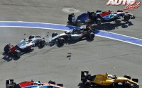 A sus espaldas, Kimi Räikkönen (Ferrari) le ganaba la posición a Bottas (Williams) y la agresividad de Daniil Kvyat (Red Bull) le llevaba a tocarse con el Ferrari de Vettel en dos ocasiones (curva 2 y curva 3), desencadenándose por detrás una “partida de bolos” con varios pilotos damnificados.