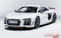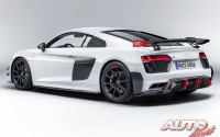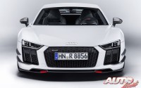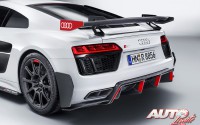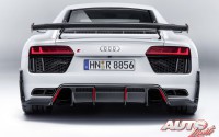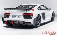 El paquete aerodinámico no solo aporta una estética exterior imponente en estos modelos sino que también mejora de forma destacable su agarre en curva. El apoyo aerodinámico se ha incrementado 100 kilogramos en el Audi R8 con el paquete aerodinámico “Audi Sport Performance”, alcanzando los 250 kg a 330 km/h.