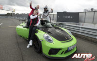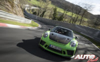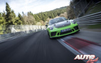 Ya en la primera intentona, el Porsche 911 GT3 RS 991 Mk II color “Verde Lizard”, con “Paquete Weissach”, llantas de magnesio y frenos cerámicos “PCCB”, paraba el crono en 6 minutos 59,3 segundos, dejando constancia de la eficacia alcanzada en el renovado modelo.