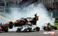 El despegue del McLaren dañaba también el alerón posterior de Daniel Ricciardo (Red Bull), que un instante después golpeaba la parte trasera del Ferrari de Kimi Ráikkönen y le pinchaba la rueda trasera derecha.