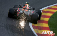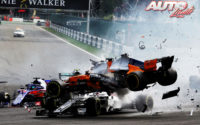 Otras emociones bien distintas son las que se vivieron en la parte trasera del pelotón, donde Nico Hülkenberg (Renault), partiendo desde la penúltima fila (P18), apuraba una frenada imposible y se empotraba envuelto en una nube de goma quemada contra el McLaren de Fernando Alonso (Hülkenberg ha sido sancionado con diez posiciones en parrilla en el próximo GP de Italia).