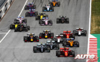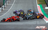 El Ferrari de Charles Leclerc salía disparado hacia esa primera curva rebautizada con el nombre de Niki Lauda y Max Verstappen (Red Bull) se quedaba literalmente clavado en el momento de la arrancada (al activar por error el sistema anticalado), siendo adelantado por los dos monoplazas de Mercedes, el McLaren de Lando Norris (que llegaba a colocarse tercero en la primera vuelta), el Alfa Romeo de Kimi Räikkönen, el Ferrari de Sebastian Vettel y también el Red Bull de Pierre Gasly, que le arrebataba la séptima plaza en la salida del cerrado giro de “Remus”.