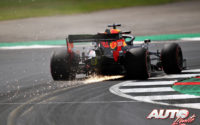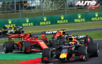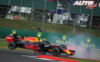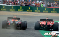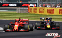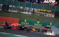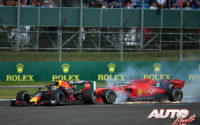 Solo un giro después, Verstappen (Red Bull) alcanzaba también a Sebastian Vettel (Ferrari) y comenzaba a disputarle la tercera posición del podio. Verstappen conseguía adelantarle por el exterior en la rápida curva de “Stowe”, pero Vettel, enrabietado, intentaba devolverle la jugada en la siguiente frenada y cometía un error de principiante, frenando tarde y llevándose por delante el monoplaza de Red Bull (la maniobra le costaba 10 segundos de penalización y dos puntos de su “Superlicencia”).