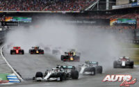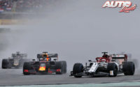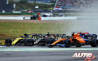 Los dos monoplazas de Mercedes se ponían al frente de la carrera y el núcleo duro de la parrilla abrazaba rápidamente a los dos monoplazas de las bebidas energéticas, con Kimi Räikkönen (Alfa Romeo) aprovechando el fallo en la arrancada de ambos Red Bull.