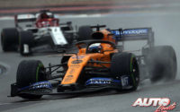 Tras el relanzamiento, convertido el circuito en un escenario donde cada uno tendrá el papel que la lluvia o la suerte le conceda, Carlos Sainz Jr (McLaren) perdía la trazada en la penúltima curva, patinaba sin control sobre la deslizante escapatoria y quedaba a escasos centímetros de golpear el muro de protección, pudiendo volver a la pista con el coche intacto y seis posiciones perdidas (P14).