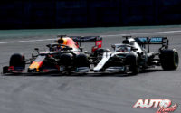 Poco le duraba el liderato, porque Max Verstappen (con neumáticos nuevos) le metía el morro ya en la frenada y le adelantaba por el exterior de la primera curva, mientras su compañero Alexander Albon (Red Bull) hacía lo propio con Sebastian Vettel (Ferrari).