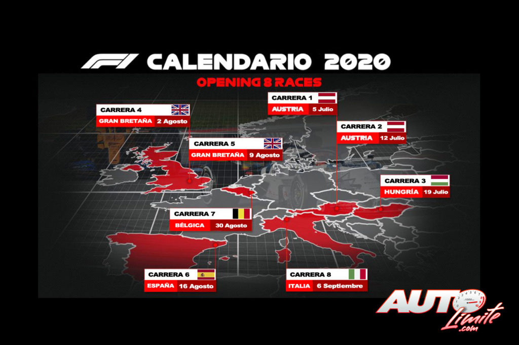 Calendario de los ocho primeros Grandes Premios de la Fórmula 1 2020, tras ser modificadas las fechas originales por el COVID-19.