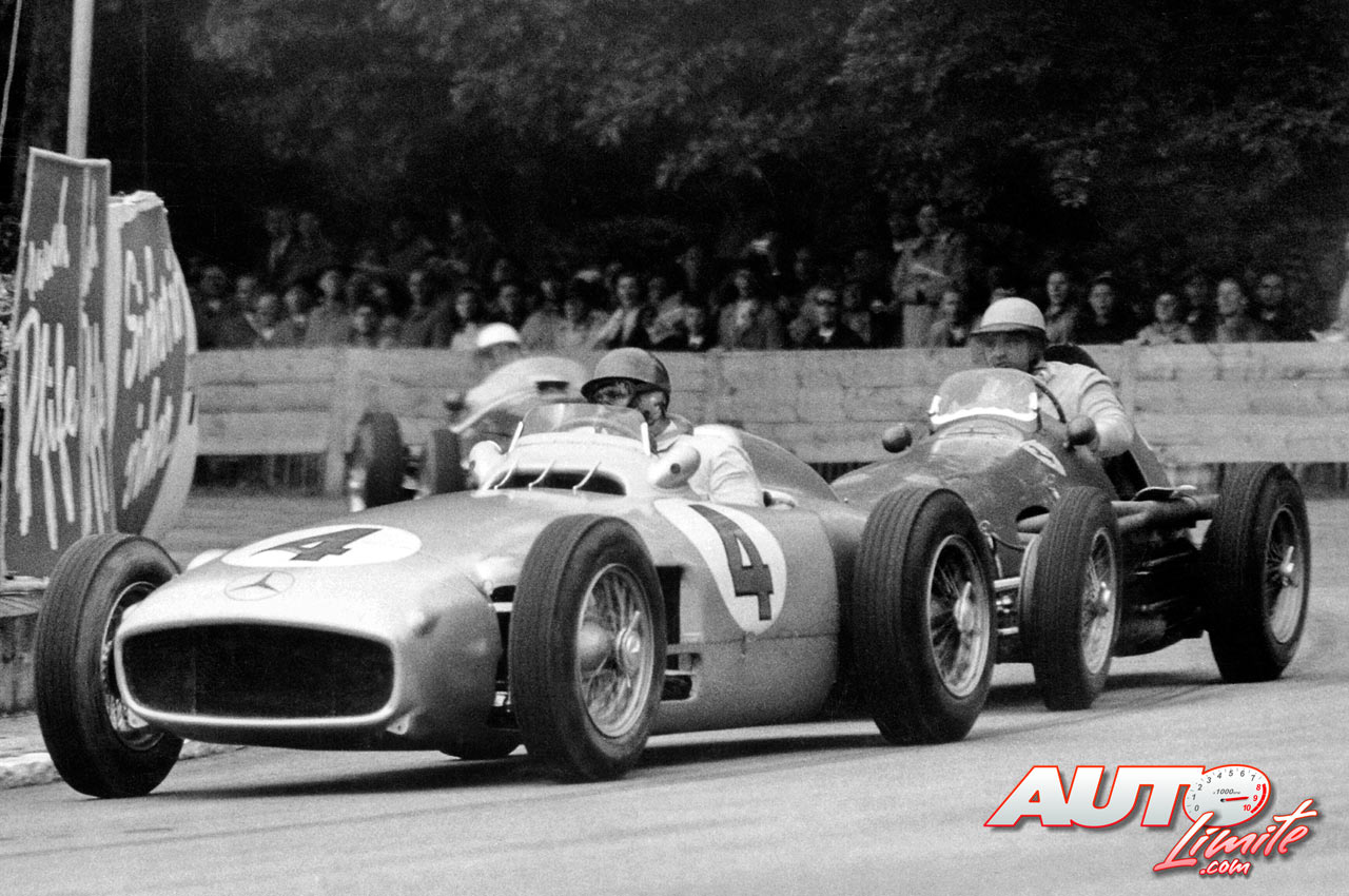 Juan Manuel Fangio (Mercedes W 196 R) perseguido por José Froilán González (Ferrari 625 F1) durante el Gran Premio de Suiza de 1954, disputado en el circuito de Bremgarten.