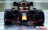 Max Verstappen (Red Bull) trataba de desequilibrar la insolente eficacia de los Racing Point sobre el mojado asfalto y en la vuelta 18 asestaba un intento de adelantamiento a Sergio Pérez que terminaba en un espectacular trompo del piloto holandés, obligándole a una parada extra para sustituir los neumáticos “cuadrados” en la doble maniobra de casi 720 grados.