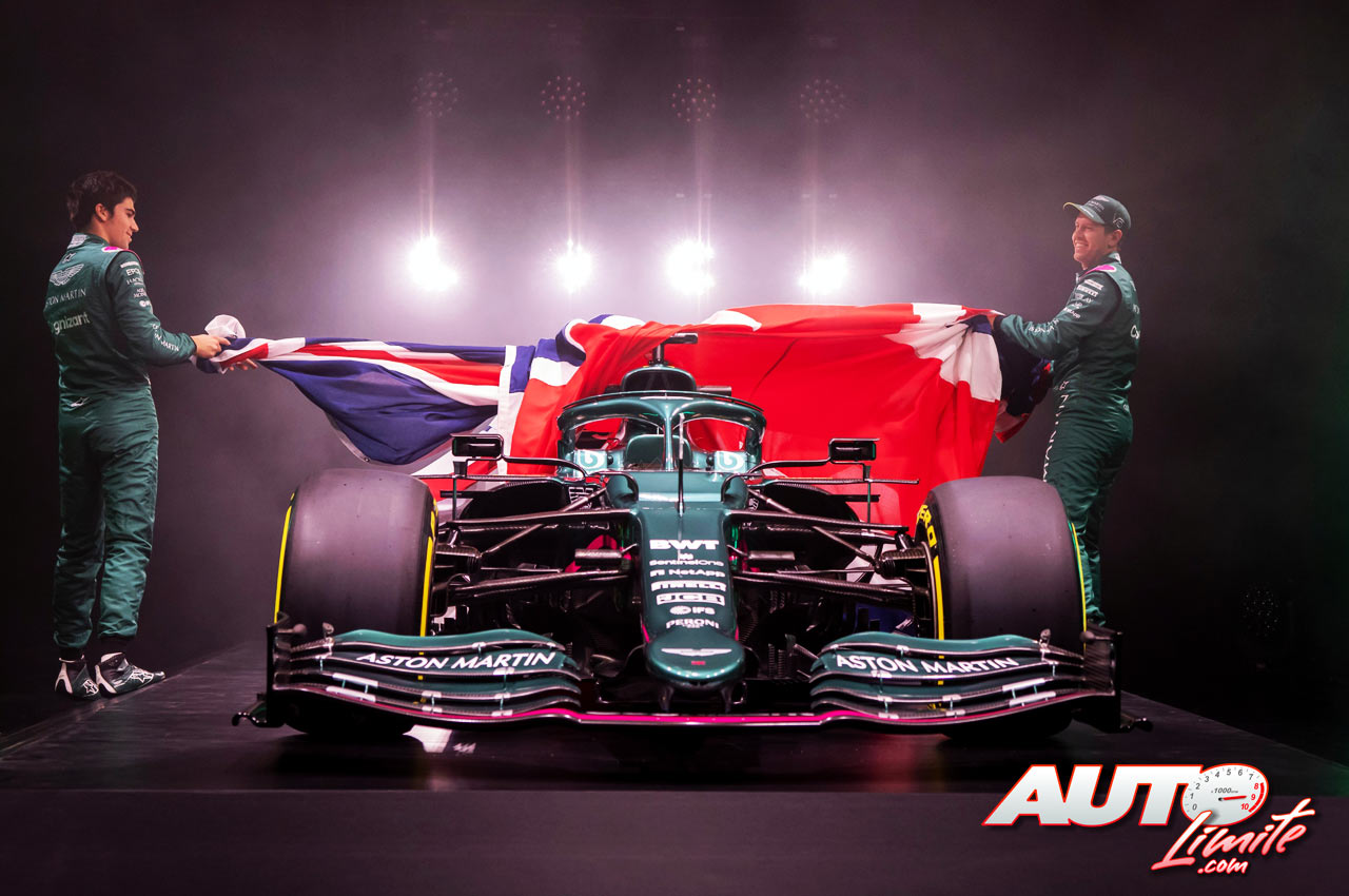 Sebastian Vettel y Lance Stroll destapando el nuevo Aston Martin AMR21 con el que van a correr durante la temporada 2021.