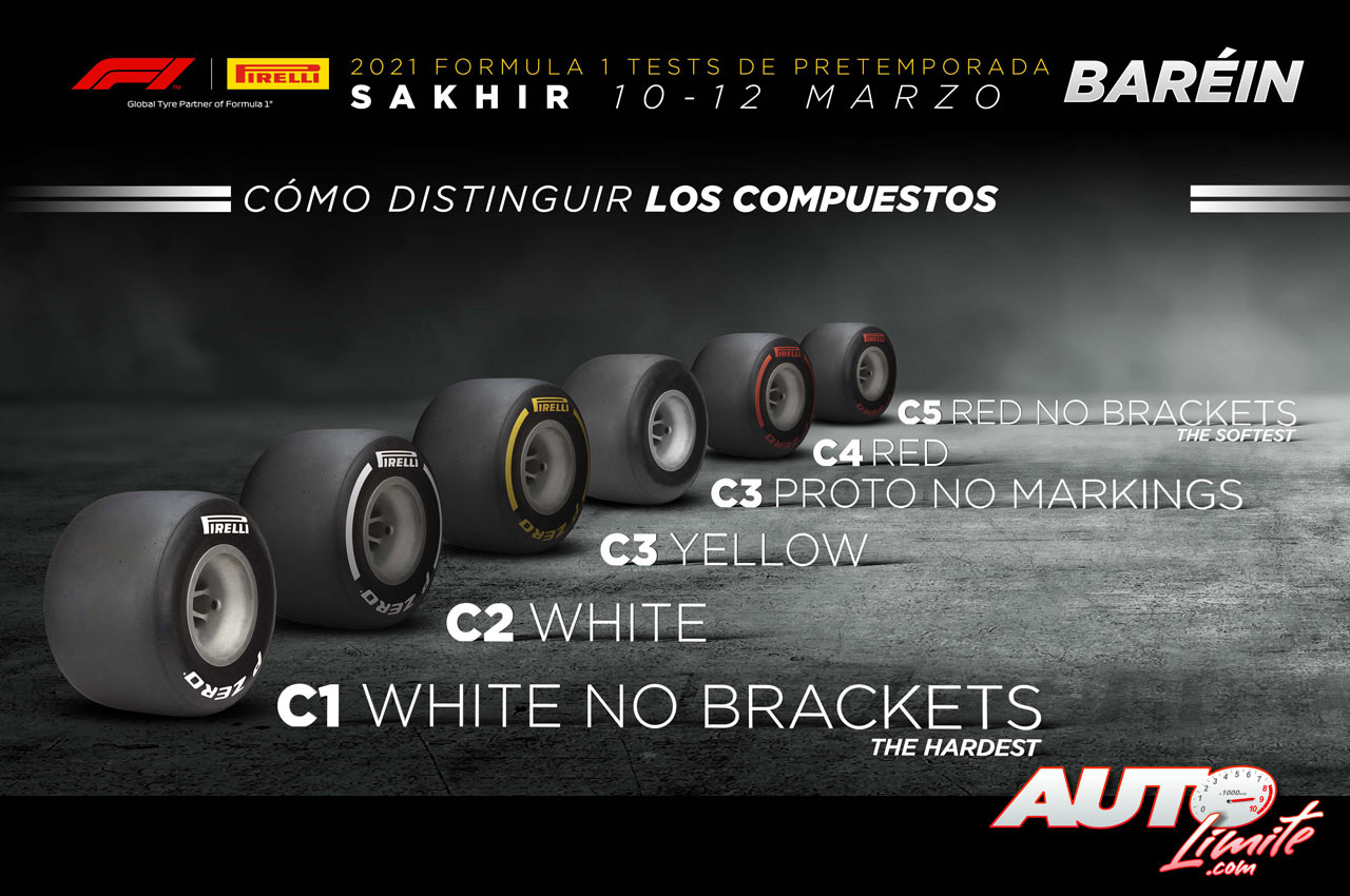 Compuestos de neumáticos disponibles durante los test de pretemporada realizados en el Circuito Sakhir de Bahréin.