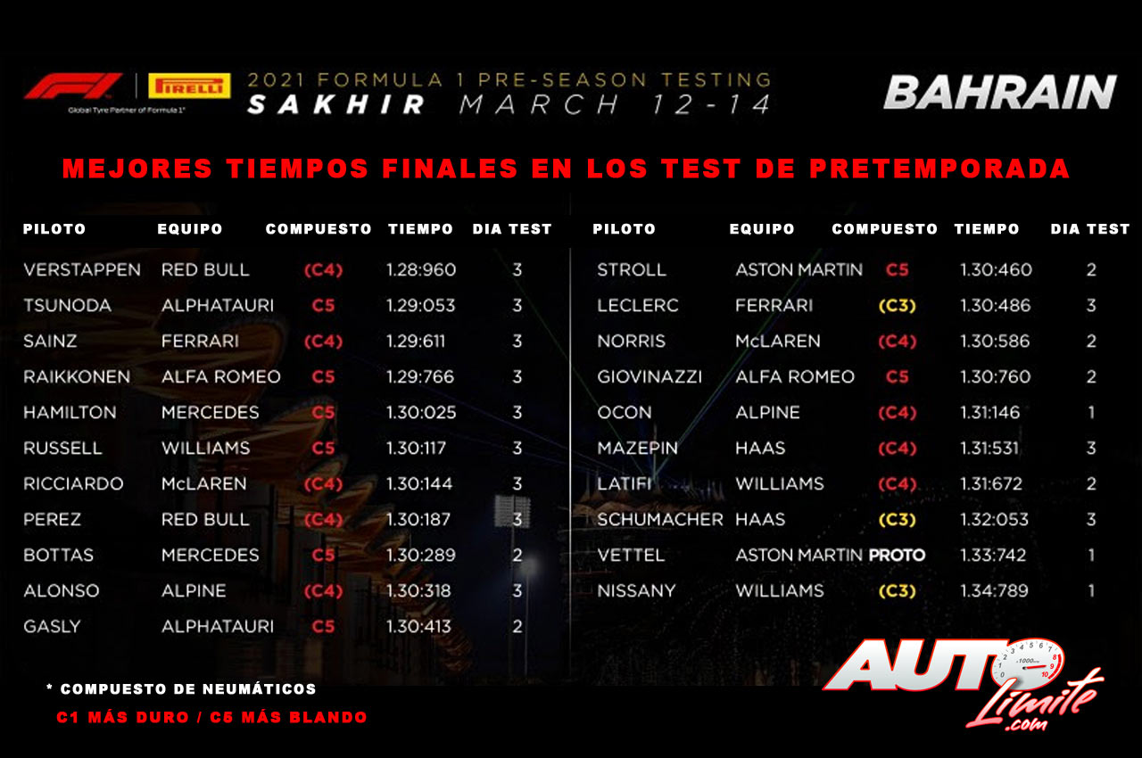 Mejores tiempos por vuelta obtenidos durante los test de pretemporada realizados en el Circuito Sakhir de Bahréin.