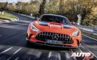 Las imágenes del “video inboard” nos dejan apreciar visualmente el impresionante ritmo al que es capaz de moverse en el “Infierno Verde” de Nürburgring-Nordschleife este Mercedes-AMG GT Black Series pilotado al límite, con velocidades que superan 290 km/h en “Schwedenkreuz”, se acerca a 270 km/h en el sector de “Kesselchen” y alcanza una punta de 311 km/h en la recta de “Döttinger Höhe”, según el propio Maro Engel, velocidades punta más elevadas que las registradas al volante del Mercedes-AMG GT3 de competición (penalizado en velocidad máxima por su mayor carga aerodinámica).