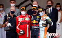 Sonrisa de satisfacción también para Carlos Sainz Jr (Ferrari), que ha rubricado su primer podio con Ferrari (P2) junto a la realeza monegasca, acompañado por Verstappen (Red Bull) y Lando Norris (McLaren), todos jóvenes, todos ambiciosos de triunfos y los tres compañeros de equipo en batallas anteriores.