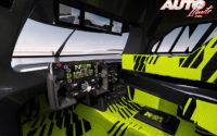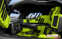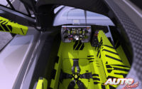 El habitáculo “i-Cockpit” del Peugeot 9X8 está acabado en el llamativo color “Kryptonite”, con el que la marca pretende que los espectadores identifiquen este modelo a primera vista (con las cámaras a bordo), contando con los principales mandos de control integrados en el volante y con retrovisores traseros mediante cámaras.