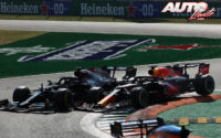 Se estaba creando la tormenta perfecta y Lewis Hamilton (Mercedes) volvía a la pista colocándose justo entre Lando Norris (McLaren) y Max Verstappen (Red Bull) en su llegada a la primera chicane. Lando pasaba limpio y Verstappen intentaba el ataque por el exterior de la primera curva, donde Hamilton ya había cubierto el hueco.
