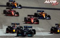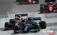 En el momento de la arrancada, Lewis Hamilton (Mercedes) conseguía emparejarse por el interior con Max Verstappen (Red Bull) y salía como virtual vencedor en el primer envite. Una maniobra apretada pero limpia, sin más dificultad para el piloto británico que ejecutarla con la precisión a la que nos tiene acostumbrados.