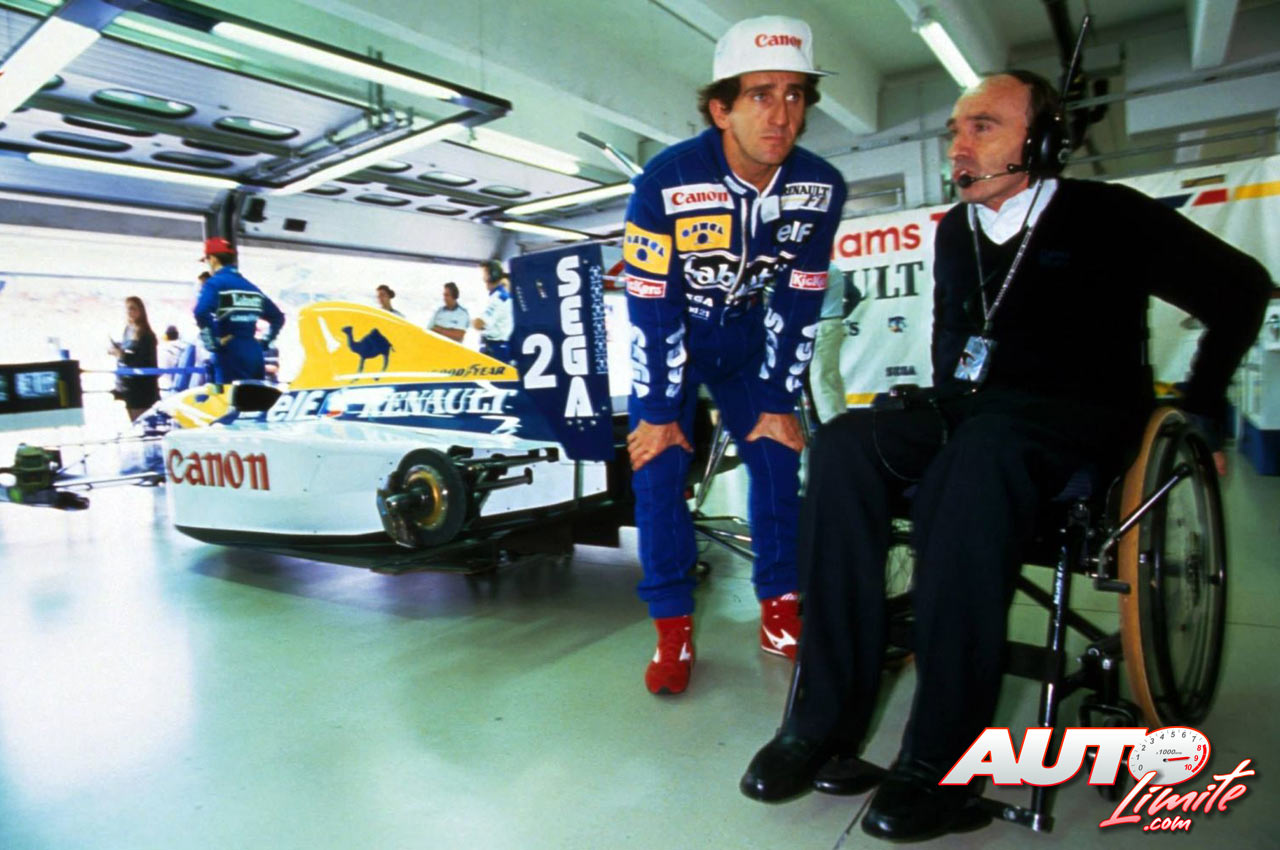 Frank Williams en el box con Alain Prost, junto al Williams-Renault FW15C con el que ganaron el título en 1993.