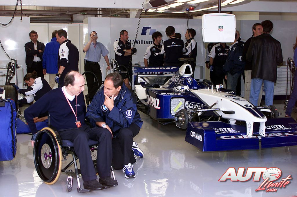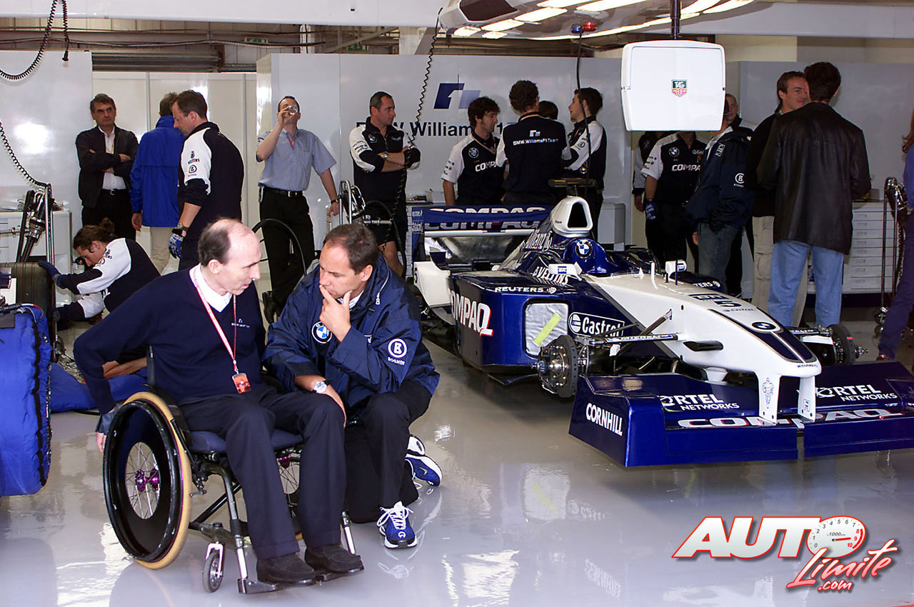 Frank Williams conversa con Gerhard Berger junto al Williams-BMW FW23, durante el GP de Gran Bretaña 2001.
