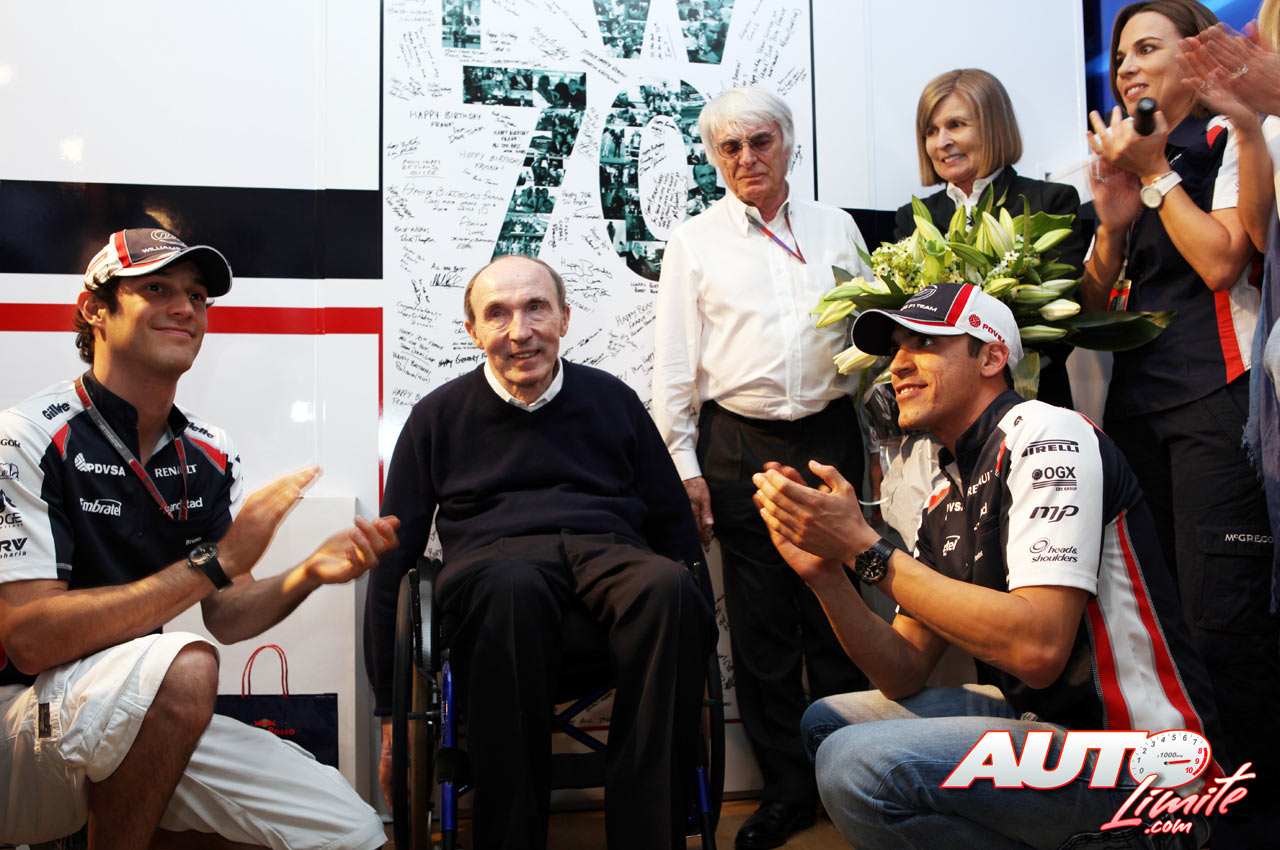 Frank Williams en la fiesta de celebración de su 70 cumpleaños, coincidiendo con el GP de España 2012. De izquierda a derecha: Bruno Senna, Frank Williams, Bernie Ecclestone, Pastor Maldonado, Virginia Berry (esposa de Williams) y Claire Williams (hija de Williams).
