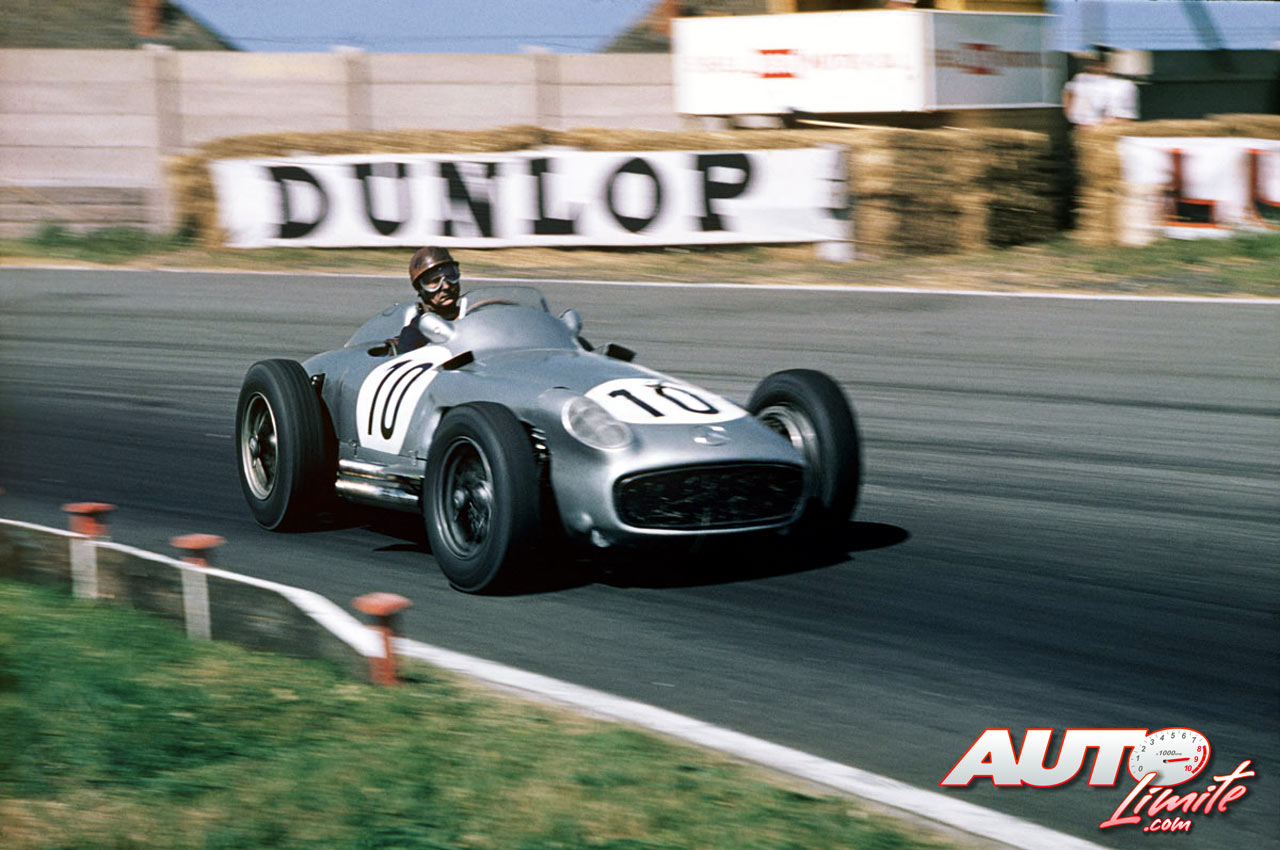 Juan Manuel Fangio (Mercedes W196) en el circuito de Aintree, durante el Gran Premio de Gran Bretaña de Fórmula 1 de 1955.