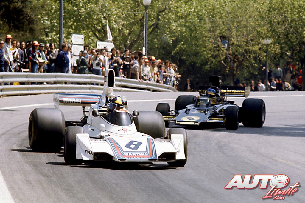 Jose Carlos Pace (Brabham BT44B-Cosworth V8) perseguido por Ronnie Peterson (Lotus 72E-Cosworth V8) en el circuito de Montjuic, durante el Gran Premio de España de Fórmula 1 de 1975.