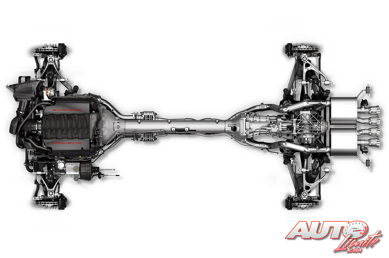 El Chevrolet Corvette C7 lleva el motor centrado por detrás del eje delantero y la caja de cambios situada por delante del eje trasero, obteniendo un reparto de pesos del 50 % en ambos ejes.