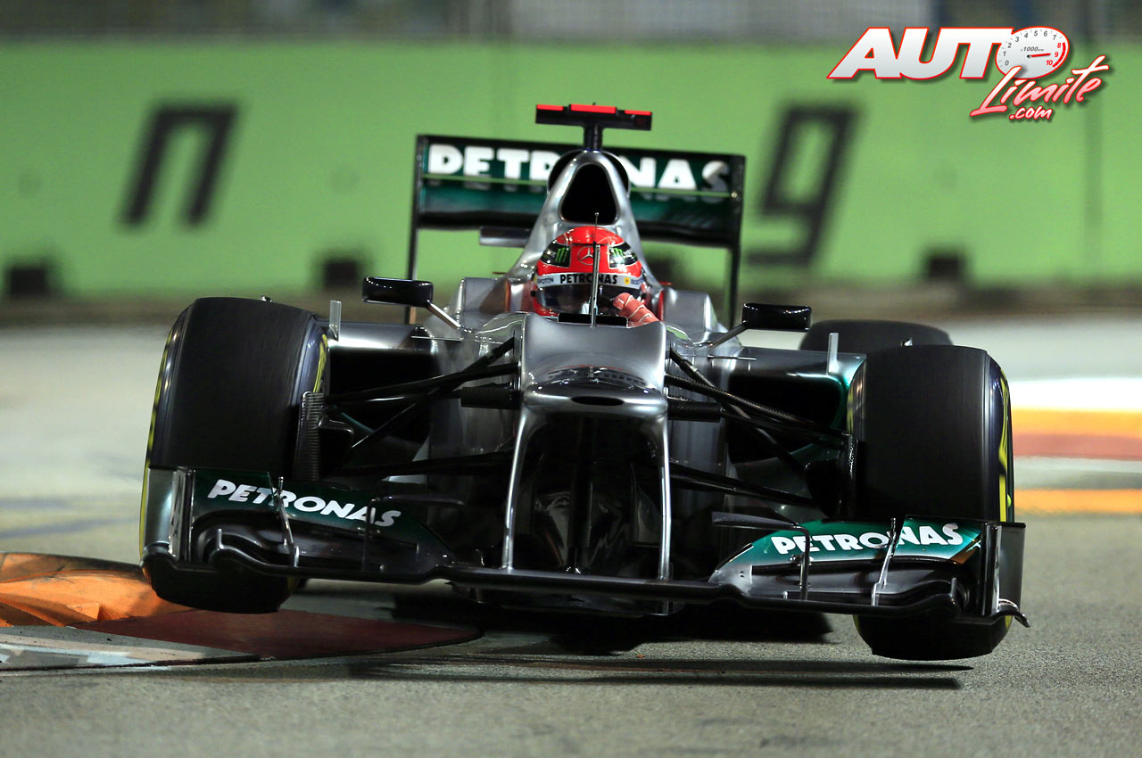 Michael Schumacher con el Mercedes F1 W03 en el Gran Premio de Singapur de 2012, disputado en el circuito urbano de Marina Bay.