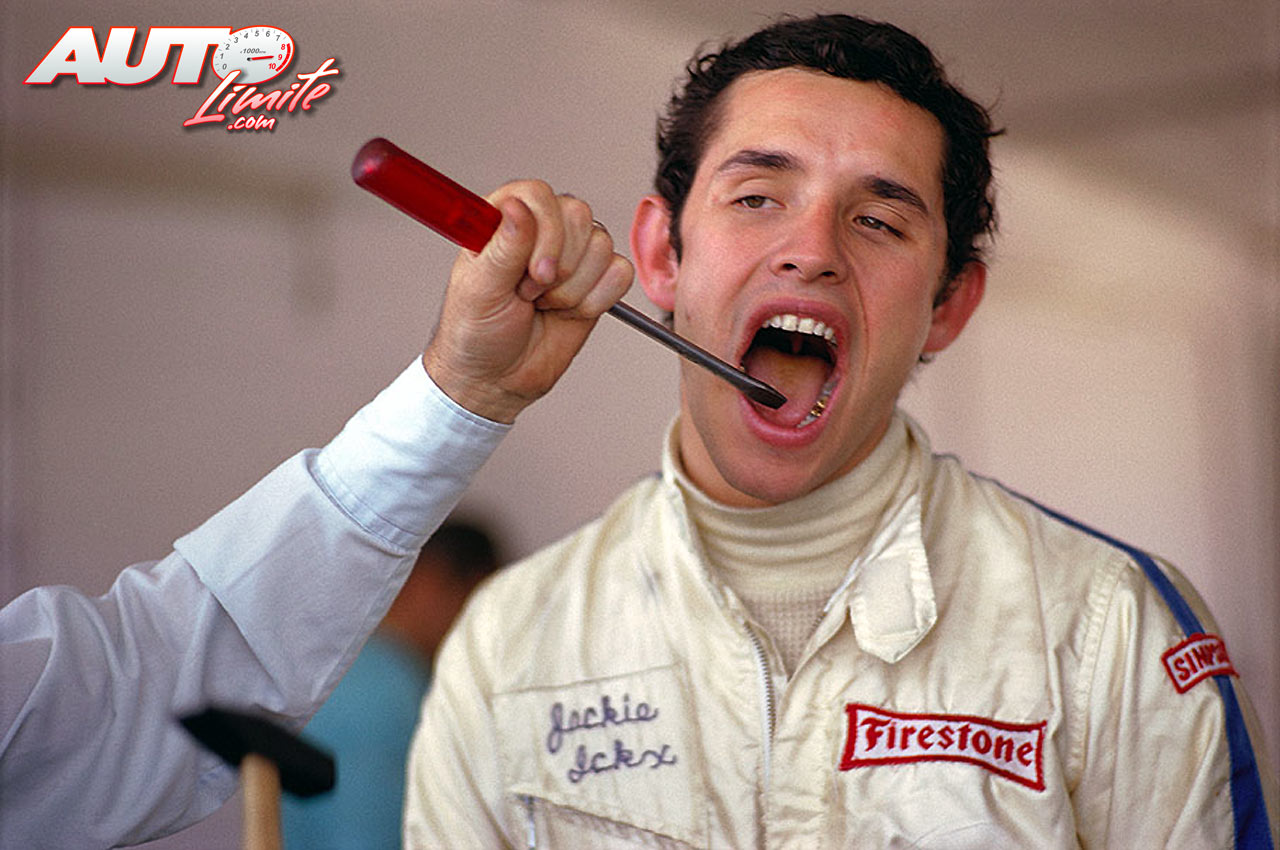 Los mecánicos de Ferrari tan pronto te regulan la carburación como te ajustan las fundas de las muelas. Esta simpática foto se la hicieron a Jackie Ickx en el circuito del Jarama, durante el Gran Premio de España de Fórmula 1 de 1970.