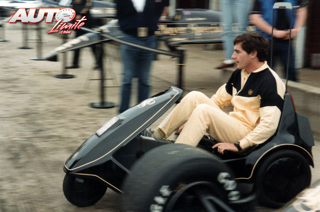 La pasión que tenía Ayrton Senna por los monoplazas es incuestionable, ya fueran de motor o de pedales. Aquí le podemos ver manejando un “prototipo especial” ecológico de su Lotus-Renault 97T, surcando el paddock del circuito de Silverstone durante el Gran Premio de Gran Bretaña de 1985.