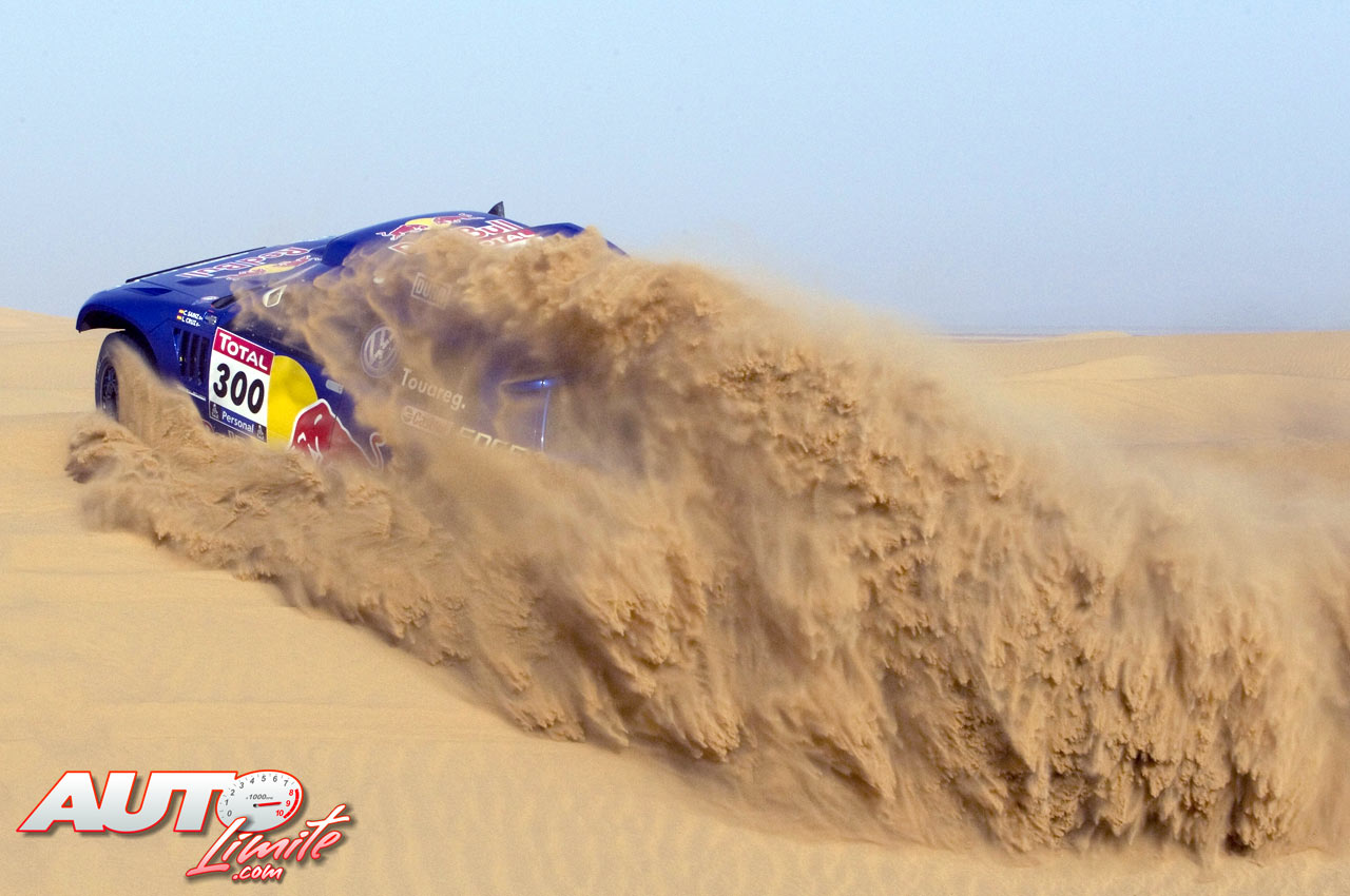 Carlos Sainz durante unas pruebas en el desierto con el Volkswagen Race Touareg 3 con el que disputó el Campeonato del Mundo de Rallyes Todo Terreno 2011.
