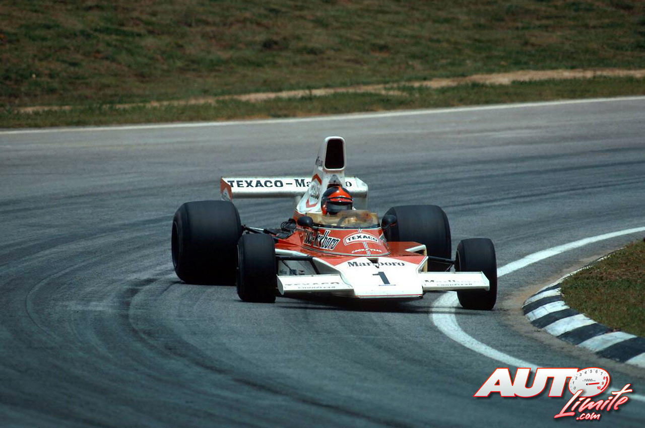Emerson Fittipaldi con el McLaren M23 - Ford Cosworth 3.0 V8 durante el Gran Premio de Brasil de 1975, disputado en el circuito de Interlagos.