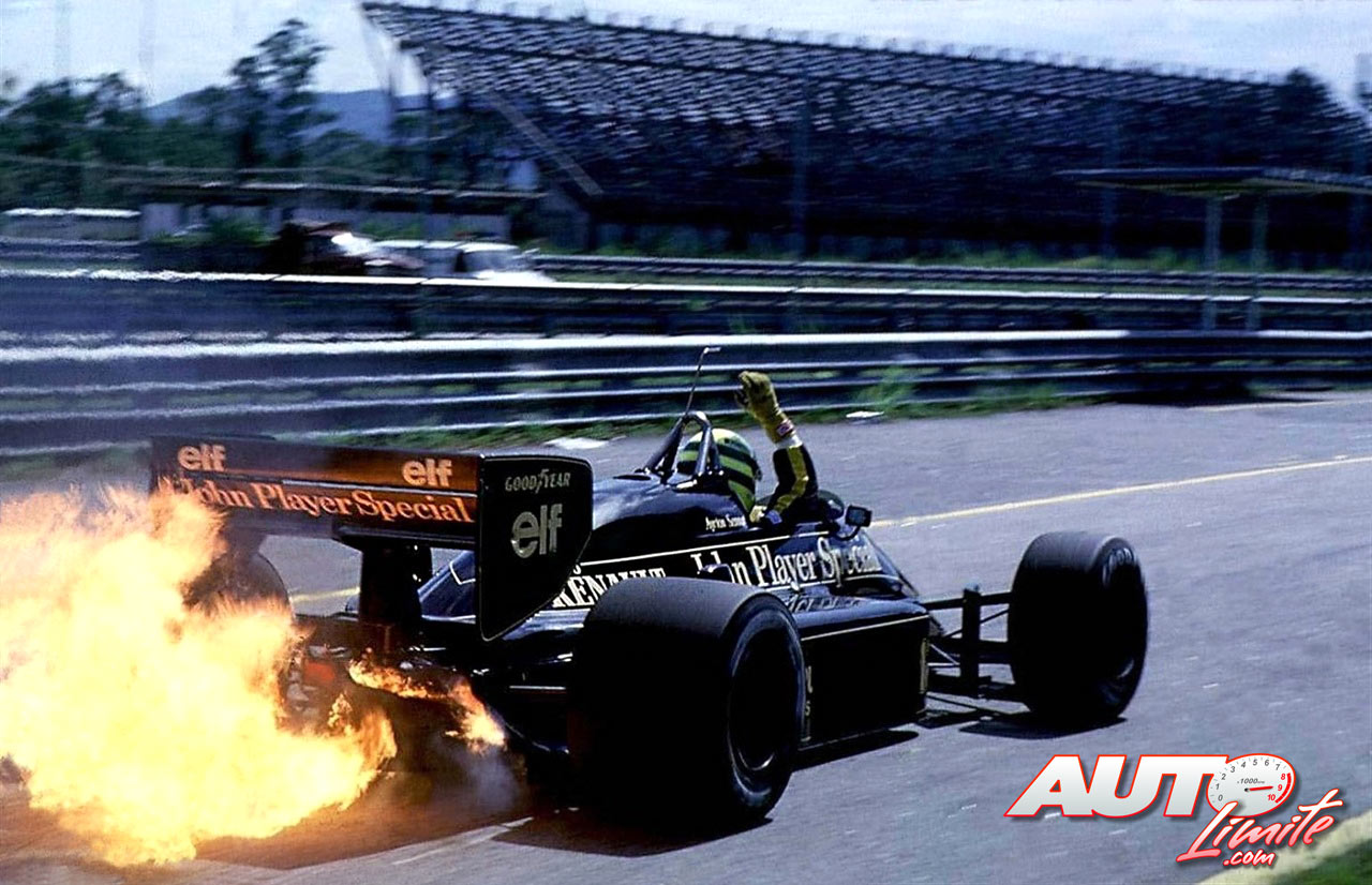 Durante la era "turbo" de la Fórmula 1 era muy habitual ver a los monoplazas echando estelas de fuego cuando sufrían una avería en el motor. Aquí podemos ver a Ayrton Senna tras romperse el propulsor Renault EF15B 1.5 V6 Turbo de su Lotus 98T, durante los entrenamientos libres del GP de Brasil de 1986, disputado en el circuito de Jacarepaguá.