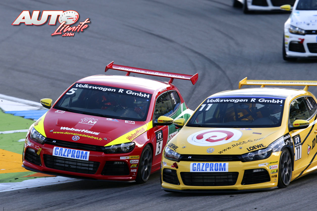 Yann Ehrlacher (nº 5) y Luca Rettenbacher (nº 11) disputan la posición en la prueba final de la Volkswagen Scirocco R Cup 2013, disputada en el circuito de Hockenheim.