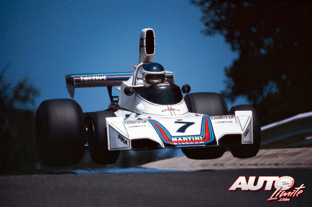 Carlos Reutemann volando sobre el circuito de Nürburgring con el Brabham-Ford BT44B, durante el Gran Premio de Alemania de 1975.
