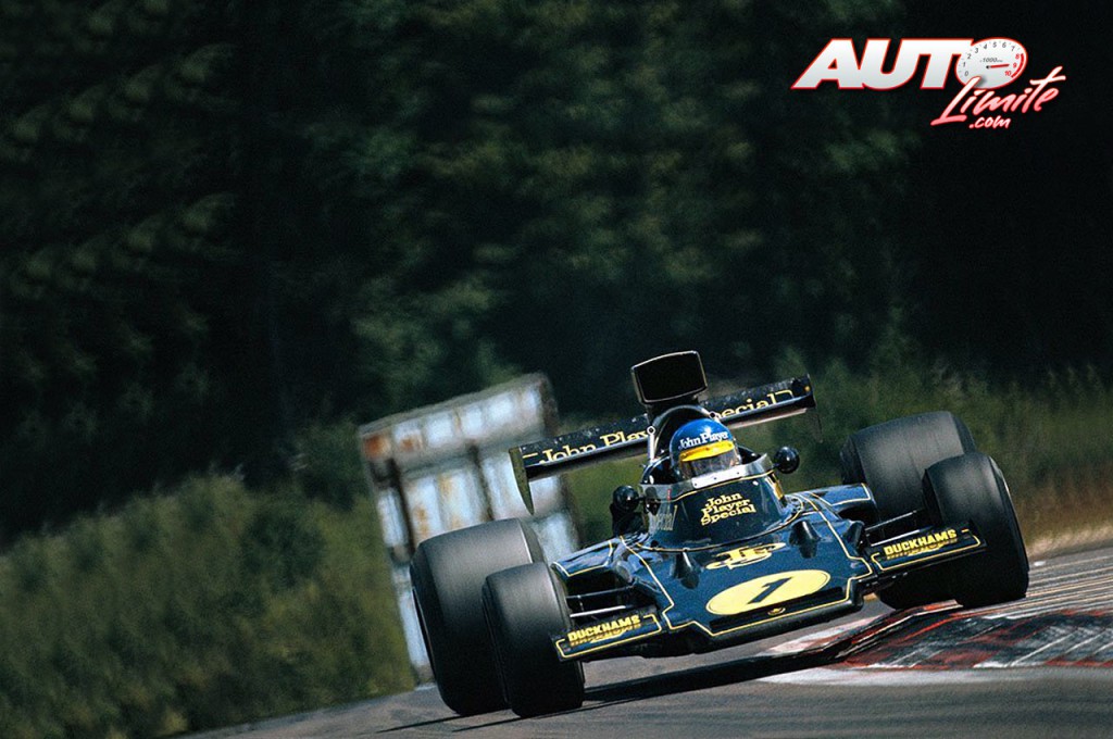 Ronnie Peterson apurando el vértice de una de las curvas de Dijon-Prenois al volante del Lotus-Ford 72E, durante el Gran Premio de Francia de Fórmula 1 de 1974.