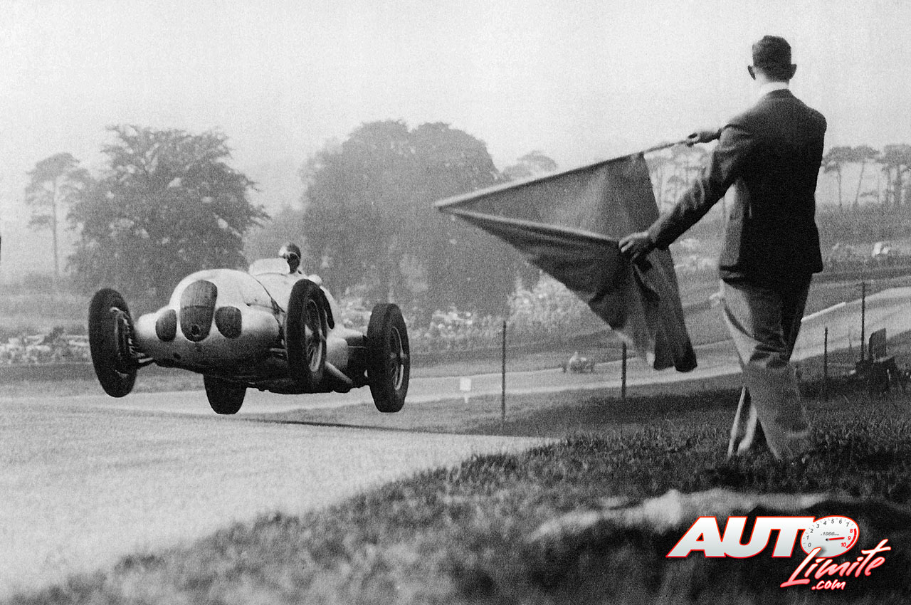 Manfred Von Brauchitsch volando con su Mercedes W125 durante el Gran Premio de Donington de 1937 (Gran Bretaña).