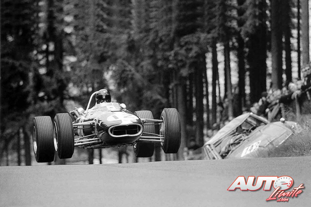 Dan Gurney volando sobre el circuito de Nürburgring al volante del Eagle-Climax MK1, durante el Gran Premio de Alemania de Fórmula 1 de 1966.