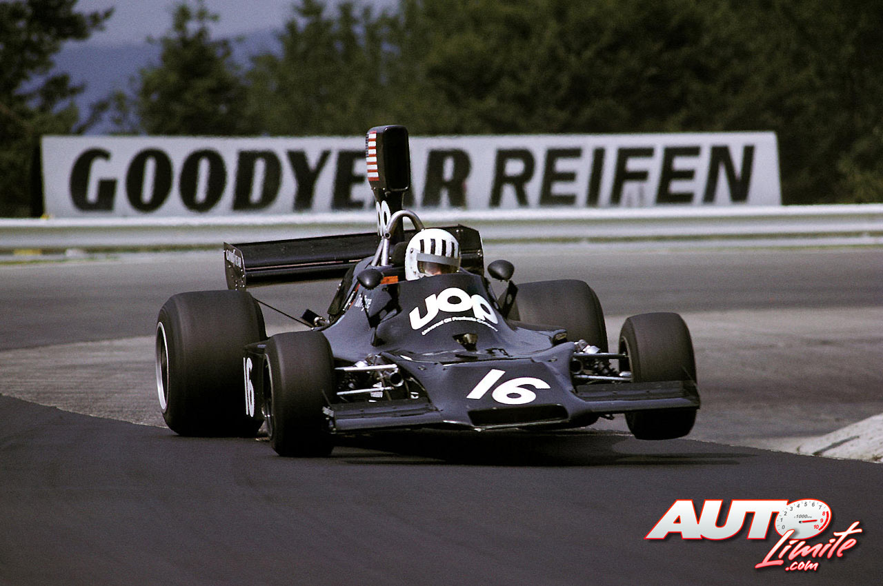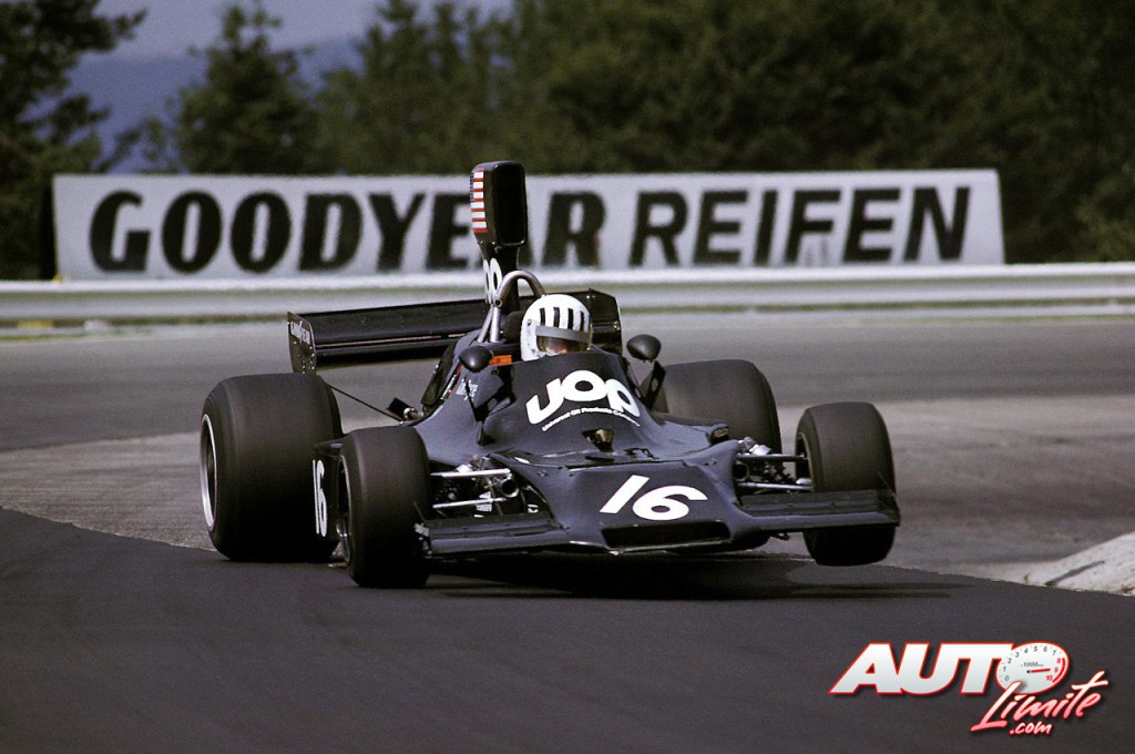 Tom Pryce abordando al límite la salida del Karussell del circuito de Nürburgring al volante del Shadow-Ford DN3, durante el Gran Premio de Alemania de Fórmula 1 de 1974.