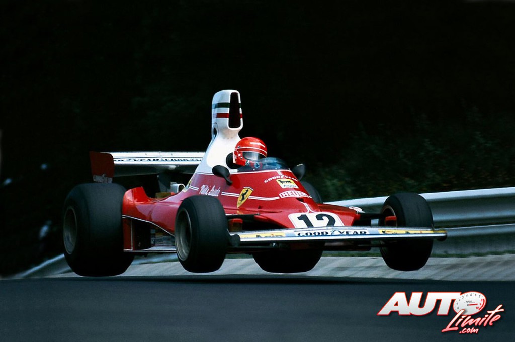 Niki Lauda volando sobre el circuito de Nürburgring al volante del Ferrari 312 T, durante el Gran Premio de Alemania de Fórmula 1 de 1975.
